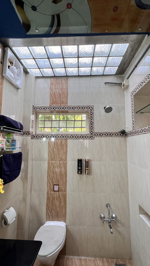Bathroom 3 at Homeland Stay, a sanctuary designed for your refreshment and relaxation. Unlike standard accommodations, this space features a unique glass-brick skylight that bathes the room in natural daylight, creating a bright and hygienic atmosphere. Whether you are starting your day or unwinding after exploring Ahmedabad, our modern facilities ensure a premium experience.