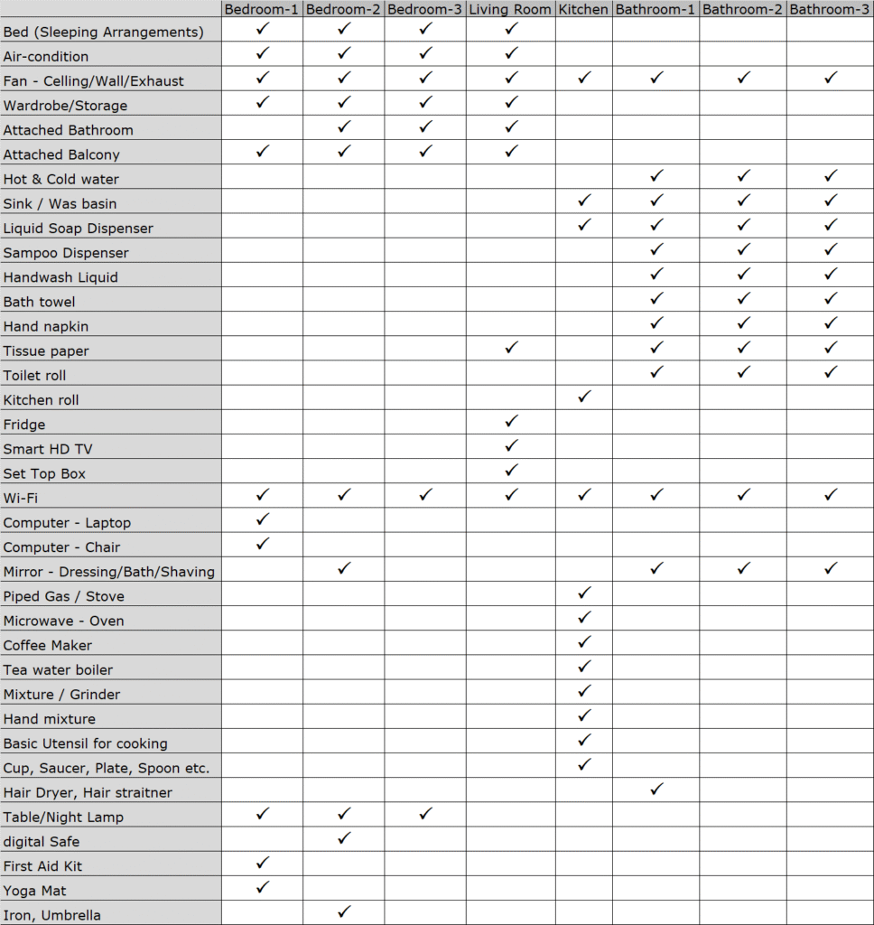 | Rooms | Bath rooms | Attached Balcony | AC / Fan | Beds | Sleeping arrangements |